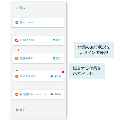 進行状況に合わせて業務フローをつなぐラインの色や形状が変わるようになりました。