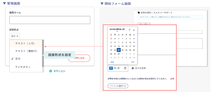 開始フォームの回答形式に「ファイル」「日付」の設定を追加しました