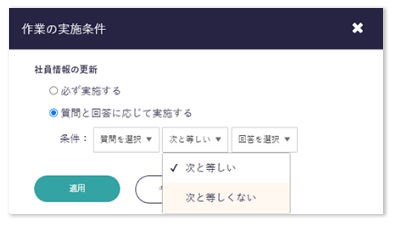作業の実施条件で選択した回答と等しくないときに実施する条件設定ができるようになりました。