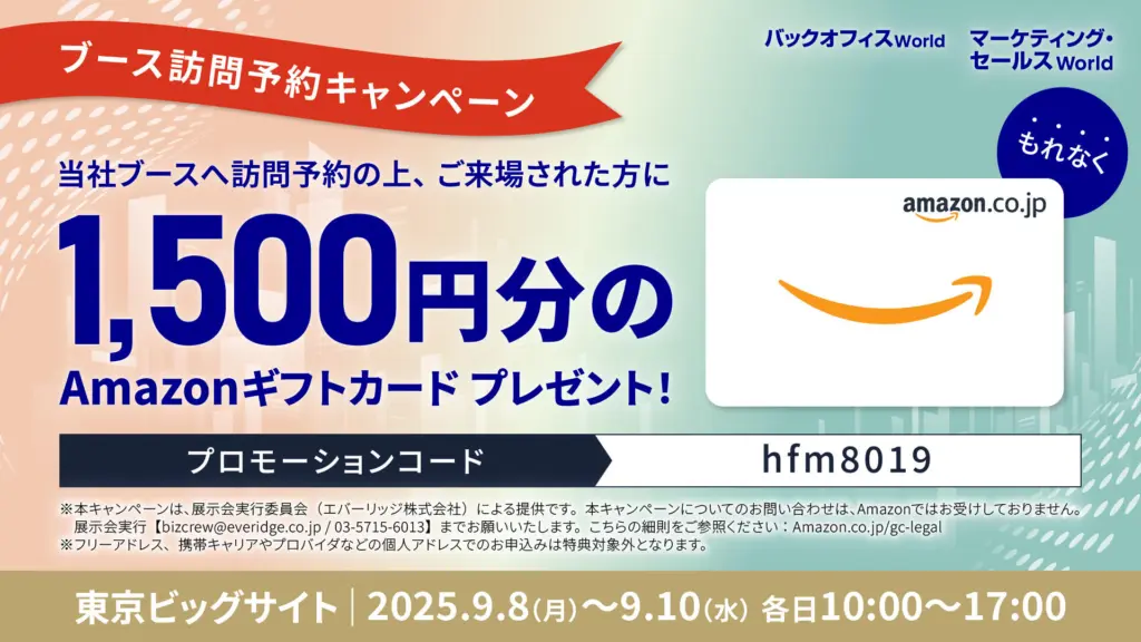また、この展示会では、ブース訪問をご予約の上、当日ご来場いただくことで、Amazonギフトカード(1,500円分)がもれなくもらえるキャンペーンを実施中です。
