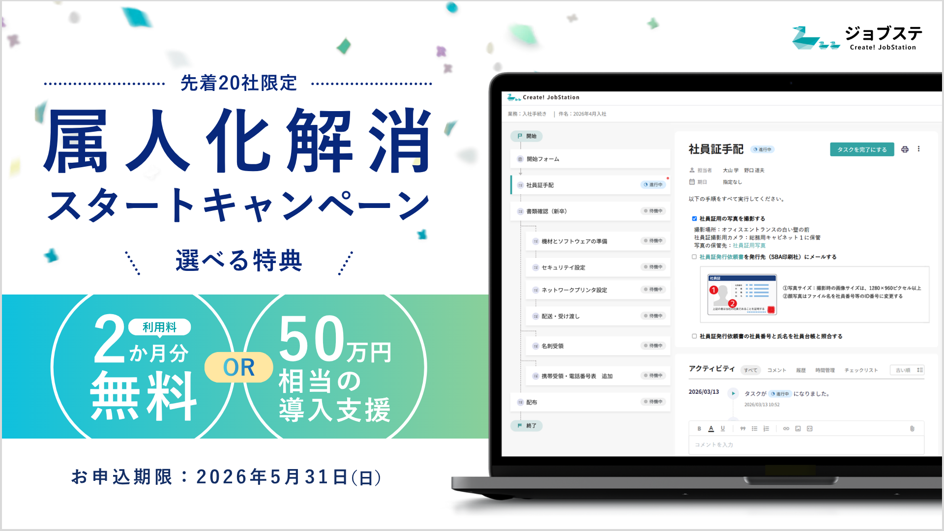 先着20社限定で、2か月分の利用料無料または50万円相当の導入支援を提供します。